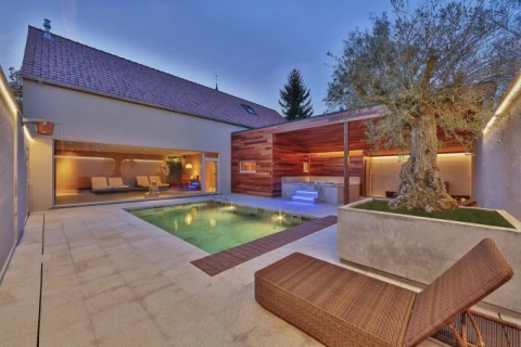 Wij nodigen u uit om onze nieuwe SPA d'hôte te ontdekken: de "Villa Cosy", welke een totale renovatie is van onze eerste villa. Het cocoon aspect zal u verbazen, alsook de nieuwe sauna, gecreëerd met oude eiken planken van een schuur uit Wisconsin, voorzien van een muur opgetrokken in zoutsteen. De verlichting schijnt door de zoutblokken en zal u een zalig gevoel van rust en welzijn brengen.Wij bieden u nu drie uitzonderlijke locaties aan : de LOFT, de Villa PRESTIGE en de Villa COSY.