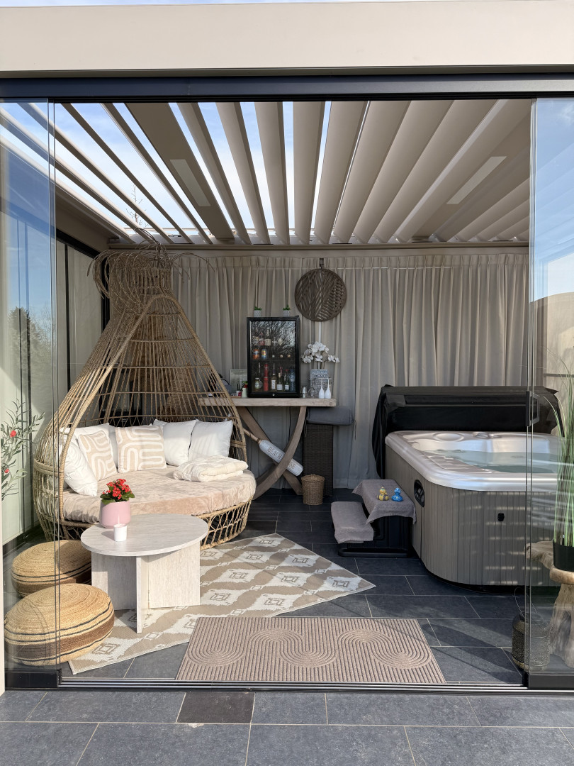 De jacuzzi staat onder een luxe overkapping, afgesloten met glazen schuifwanden. Bij slecht weer is deze altijd toegankelijk.