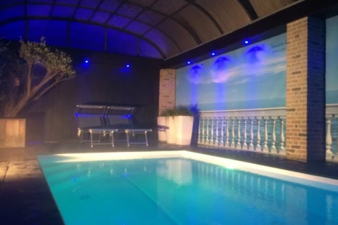 Super-gezellige privé-sauna met gegarandeerde hygiene. Hemels sauna-plezier ervaren in een sfeervolle omgeving met: overdekt of openlucht zwembad 30° (dak kan volgens wens klant helemaal open of dicht), jacuzzi 38°, panoramische Finse sauna met zicht op zwembad, Infra-rood cabine, dubbele douche met ingebouwde zonnebank, relaxruimte met zelfbedieningsbar en een uitgebreide lijst voor allerlei hapjes.