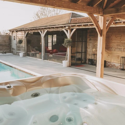 Prachtig sauna complex met buiten verwarmd zwembad (van maart tot dec) met mogelijkheid om te overnachten, Jacuzzi, sauna, stoomcabine, regendouches, ligbedden buiten en binnen, infrarood bank met uitzicht op de prachtige velden.