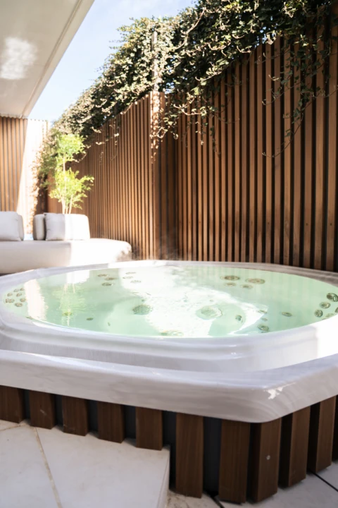 Ultieme ontspanning in privé wellness met sauna, jacuzzi, behandelingen, culinaire ervaring, en hoogwaardige producten, te midden van privacy en comfort.